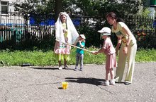 Детство навсегда останется самой счастливой и беззаботной порой для многих из нас. В первый день лета отмечается международный праздник – День защиты детей. Радостно, звонко, тепло и красочно прошёл главный праздник детства в нашем детском саду. Все педагоги старались сделать так, чтобы этот праздник надолго запомнился детям. Мы постарались в этот день создать праздничную атмосферу и порадовать детей весёлыми играми, песнями, танцами. Территорию детского сада и центральный вход в детский сад украсили разноцветными шарами и цветами из воздушных шаров, звучала весёлая музыка, поднимая весёлое настроение у детей. Праздник начался с веселой песни, которая создавала праздничное настроение. В гости к детям младшей группы «Солнышко» приходил веселый Карлсон. В гостях у ребят средних групп «Гномики» и «Звездочки» была забавная Забияка. Ребята отправились в путешествие, что бы выручить Солнышку и встретить Лето. Воспитанники вместе с гостями, ребята участвовали в играх, читали стихи про безоблачное детство, пели песни о дружбе, танцевали, даже попали в "Мыльную бурю". Закончился праздник зажигательной, поднявшей настроение дискотекой и вручением сладких призов.