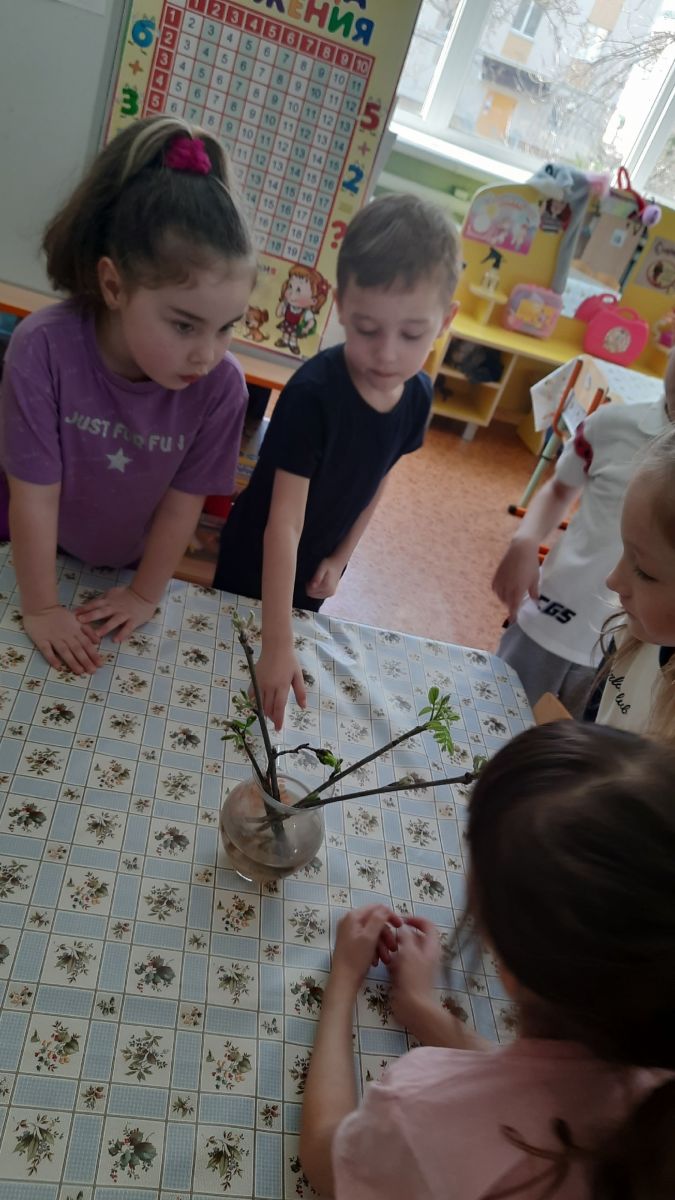 Перед этим была проведена предварительная работа: рассматривание почек на деревьях, растущих на участке детского сада; чтение стихов, разгадывание загадок; беседы с детьми на тему: "Зачем нужна вода?" Через эксперимент-наблюдение за развитием почек веточек рябины у детей развивается интерес к познавательной деятельности. Уточнили знания о том, что ветки могут расти и развиваться, если для этого созданы необходимые условия (свет, вода, тепло). Каждый день ребята наблюдают за ветками и отмечают их изменения.
