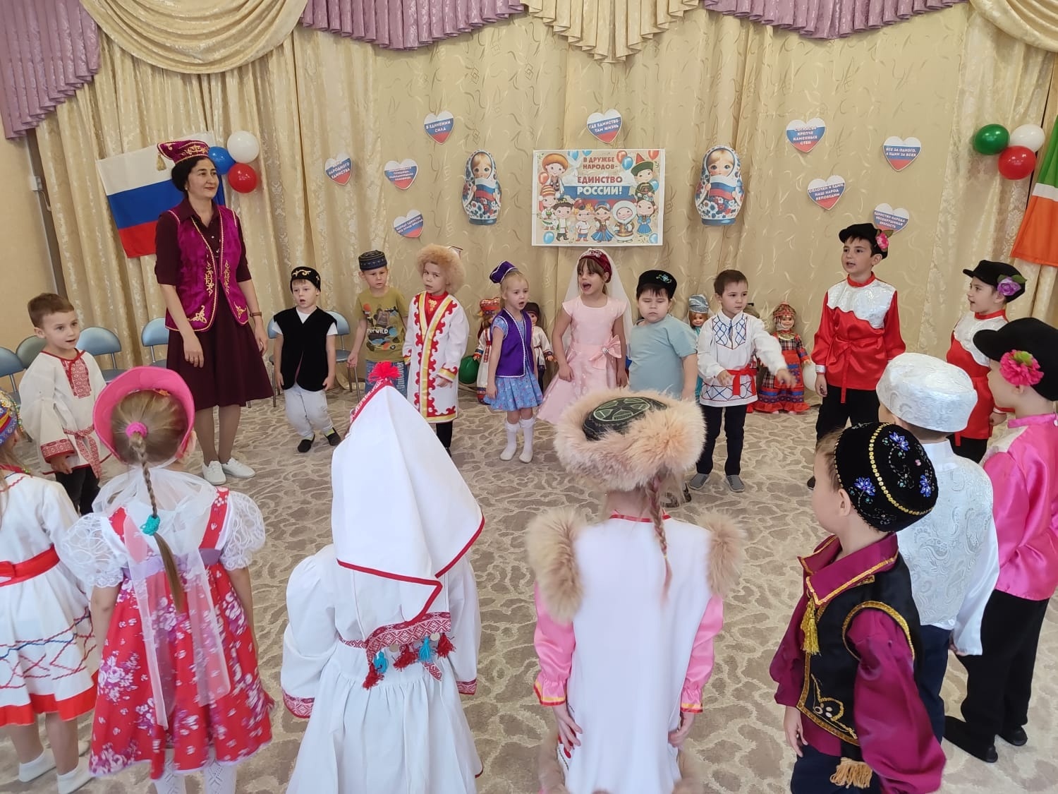 Завершились мероприятия тематическим развлечением, на котором ребята играли в национальные игры, читали стихи, пели песни, водили хороводы. На детях были яркие национальные костюмы, которые символизировали многообразие культур и традиций нашего народа.