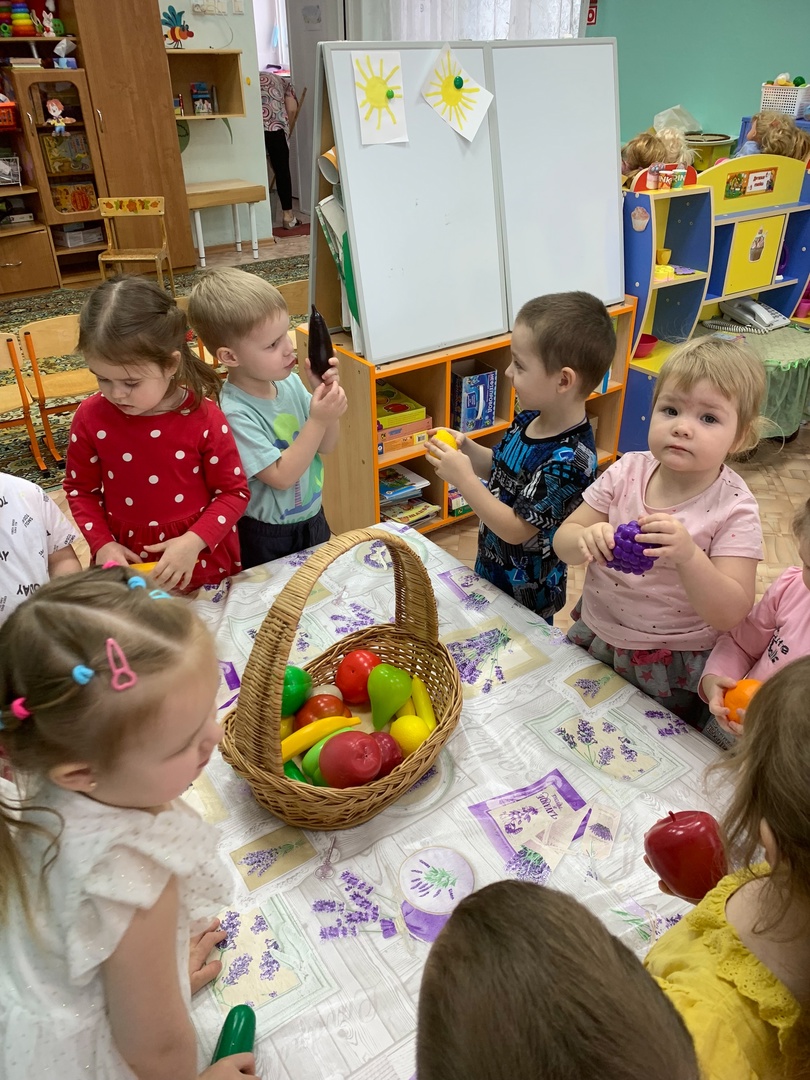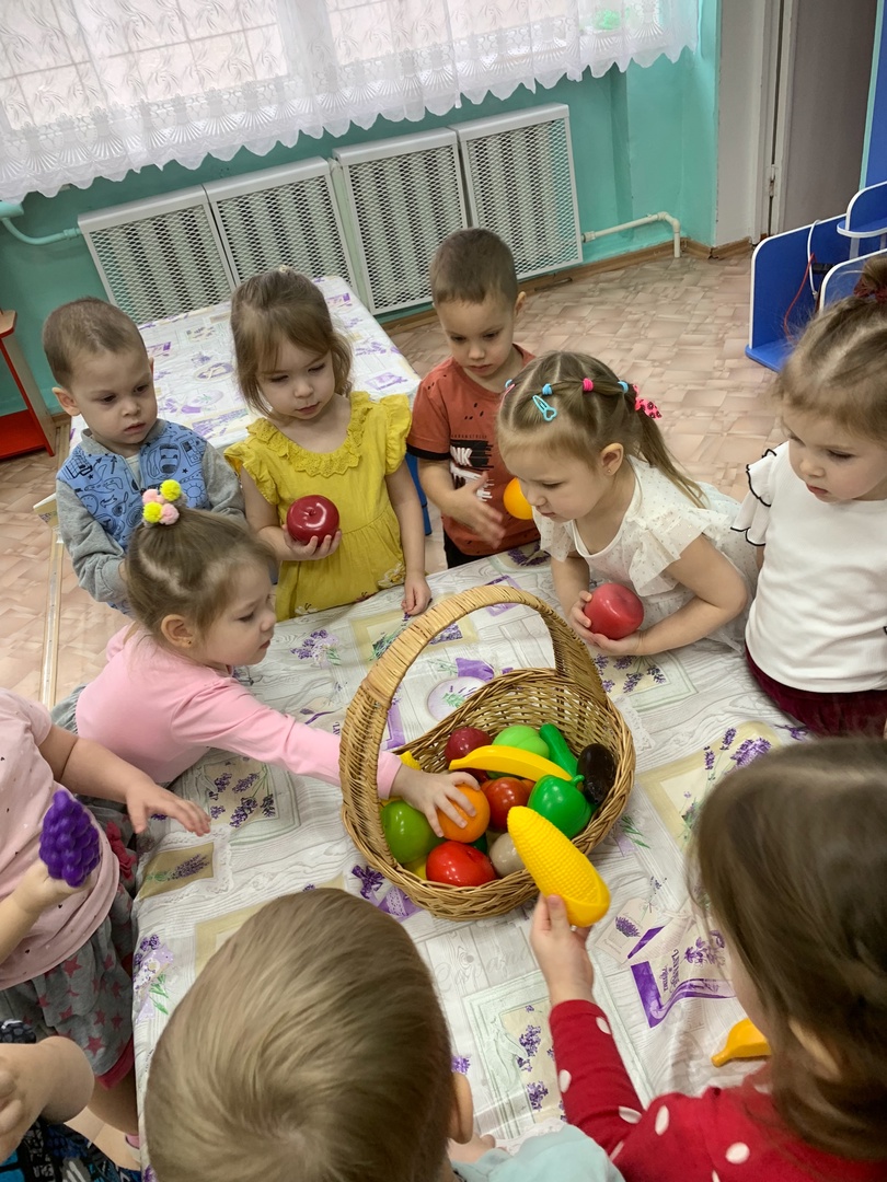 Ребята группы « Почемучки» на занятии по окружающему миру закрепляли умение группировать овощи и фрукты. В игровой форме учились употреблять в речи названия овощей и фруктов , а также ребята проявляли желание «угощать» друг друга полезными дарами.