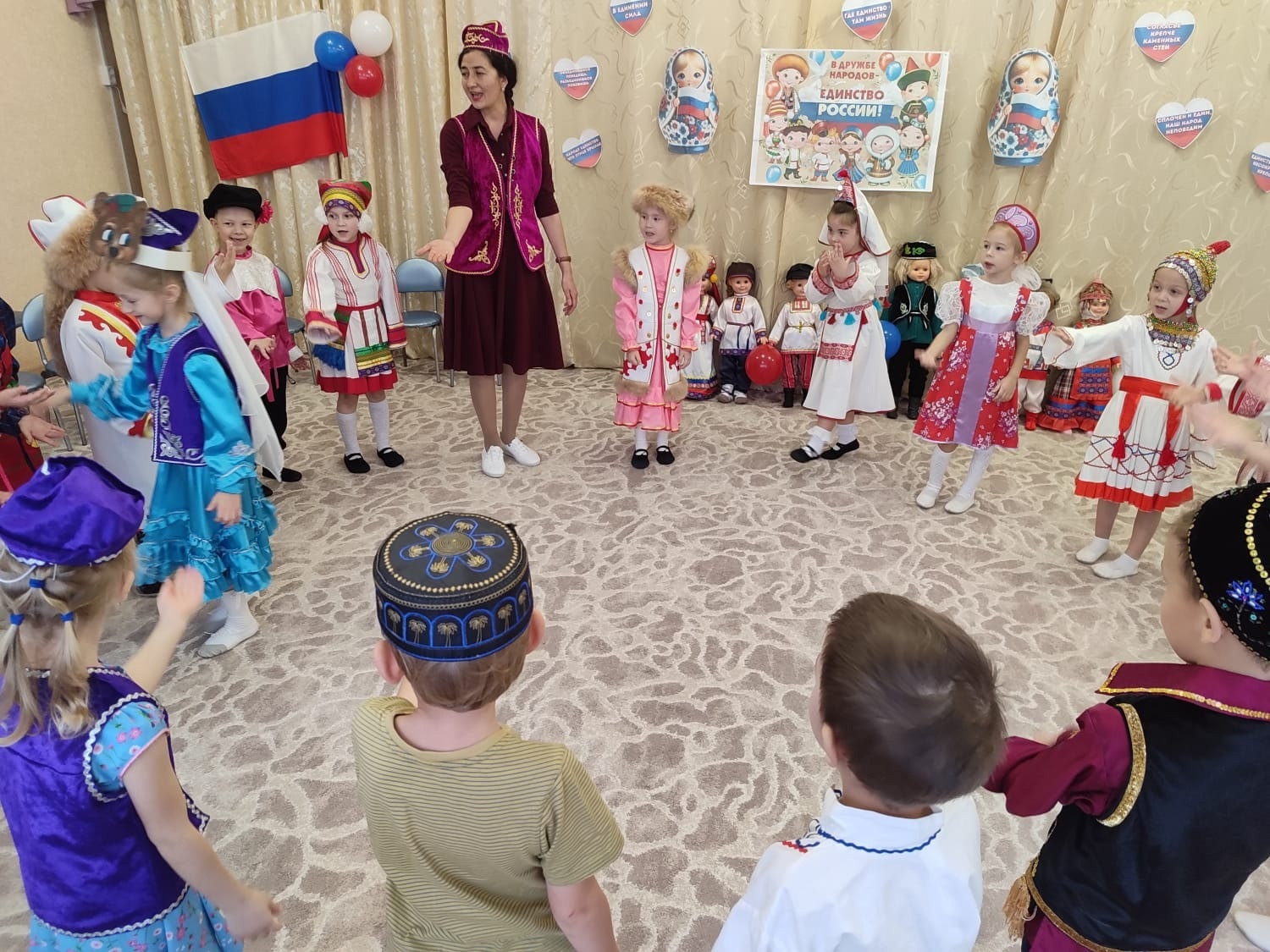 Дети узнали о том, как в разные времена люди объединялись для достижения общей цели, и как важно быть вместе, поддерживать друг друга и уважать культуру и традиции разных народов, познакомились с историей возникновения праздника, подвигами наших предков во имя независимости Родины. Закрепили знания о государственных символиках.
