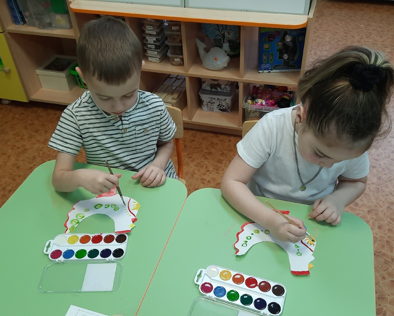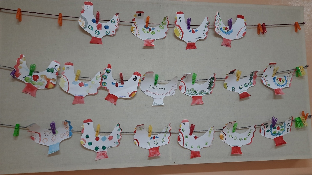 Дымковская игрушка - один из самых старинных прмыслов Руси, который существует несколько сотен лет. Все узоры в дымковской росписи знаковые и связаны с природой. Сегодня на занятии с ребятами украшали петушка элементами дымковской росписи (кольцо, точки, палочки, волнистые линии), взяв определённые цвета (красный, жёлтый, зелёный, синий).