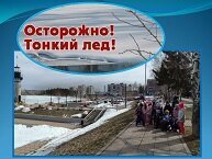 Весна прекрасна, но и опасна, если забывать простую истину: не выходить на подтаявший лед! Чем опасен тонкий лед? Почему нельзя играть у воды? И как спасти человека, если он оказался в холодной воде. Об этом и многом другом дети узнали во время целевой экскурсии «Опасности тонкого льда». Придя в детский сад, дети повторили эти правила уже с помощью любимых мультперсонажей Нюши и Бараша в известном анимационном сериале «Азбука безопасности».