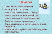 Несоблюдение правил безопасности на водных объектах в осенне – зимний период часто становится причиной травматизма и гибели людей, и дети – не исключение. Детская забава вблизи водоемов может привести к опасности, поэтому задача взрослых – уберечь каждого ребенка! Будьте предельно внимательны, не оставляйте ваших детей без присмотра! Объясните детям, как опасно находиться в осенне-зимний период около водных объектов и на льду рек!