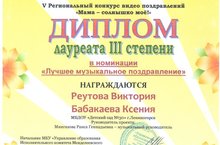 Поздравляем воспитанниц подготовительной группы Реутову Вику и Бабакаеву Ксению, музыкального руководителя Мингазову Р.Г. с 3 местом в региональном конкурсе видео поздравлений «Мама-солнышко моё!»