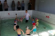 10 апреля 2018 года в нашем детском саду в бассейне инструктор по плаванию Васильева Л.Р. провела открытое занятие для родителей. Целью было закрепить умение перемещаться по дну бассейна различными способами, содействовать совершенствованию двигательных навыков и умений, создавать положительный эмоциональный настрой на занятиях, воспитывать потребность в здоровом образе жизни. У родителей была возможность побывать в бассейне, увидеть достижения детей и результаты работы инструктора по плаванию.