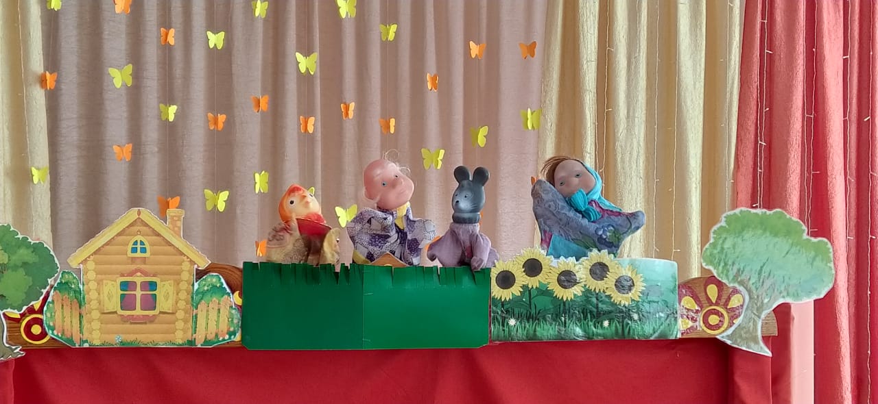 С учетом национального состава воспитанников младших групп были выбраны замечательные сказки: русская народная - «Курочка Ряба » и татарская народная-«Медведь и Дед»