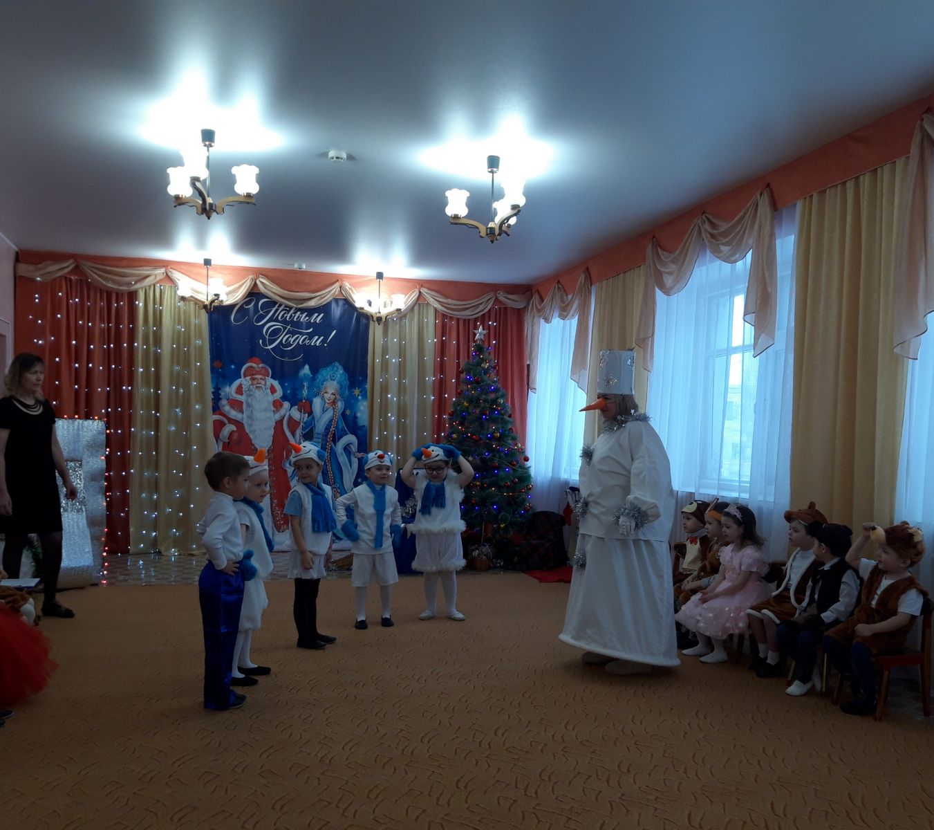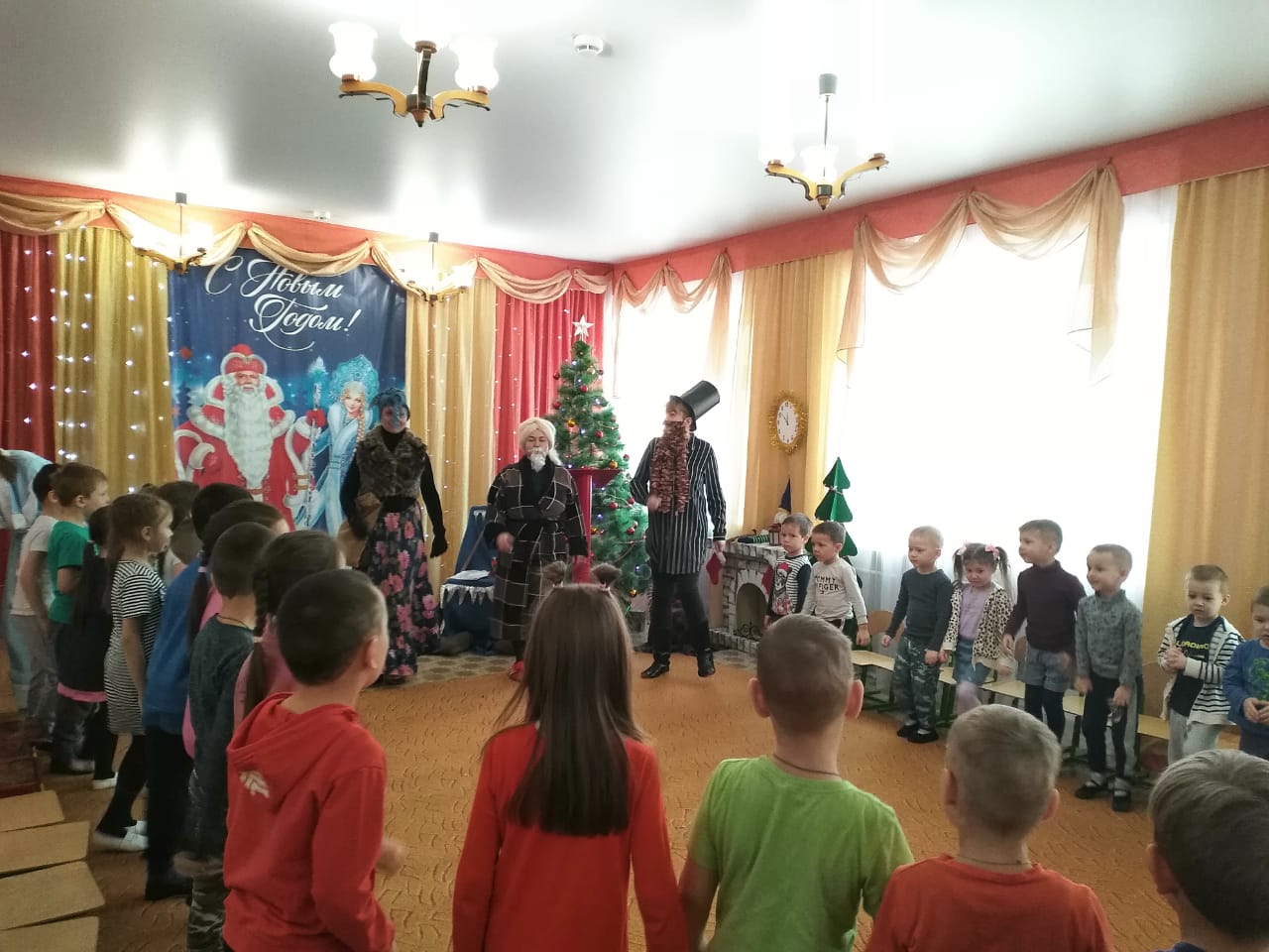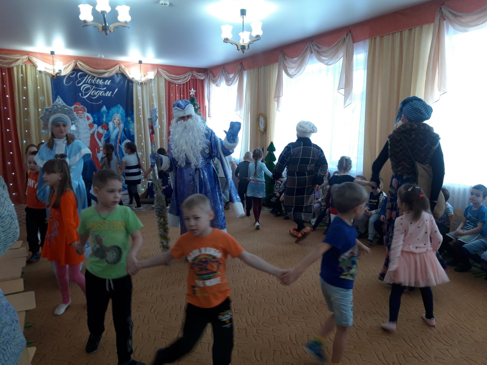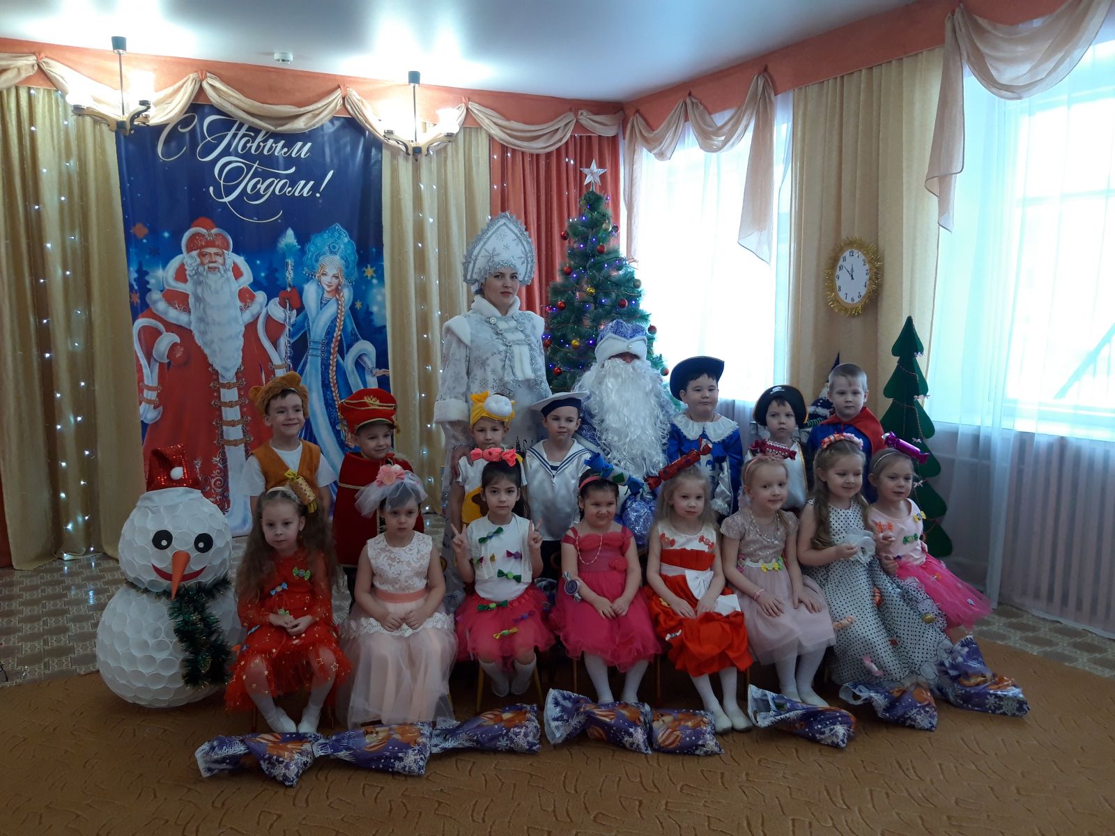 С появлением Деда Мороза и Снегурочки начался настоящий праздник с песнями и танцами, хороводами вокруг ёлки, с сюрпризными моментами.