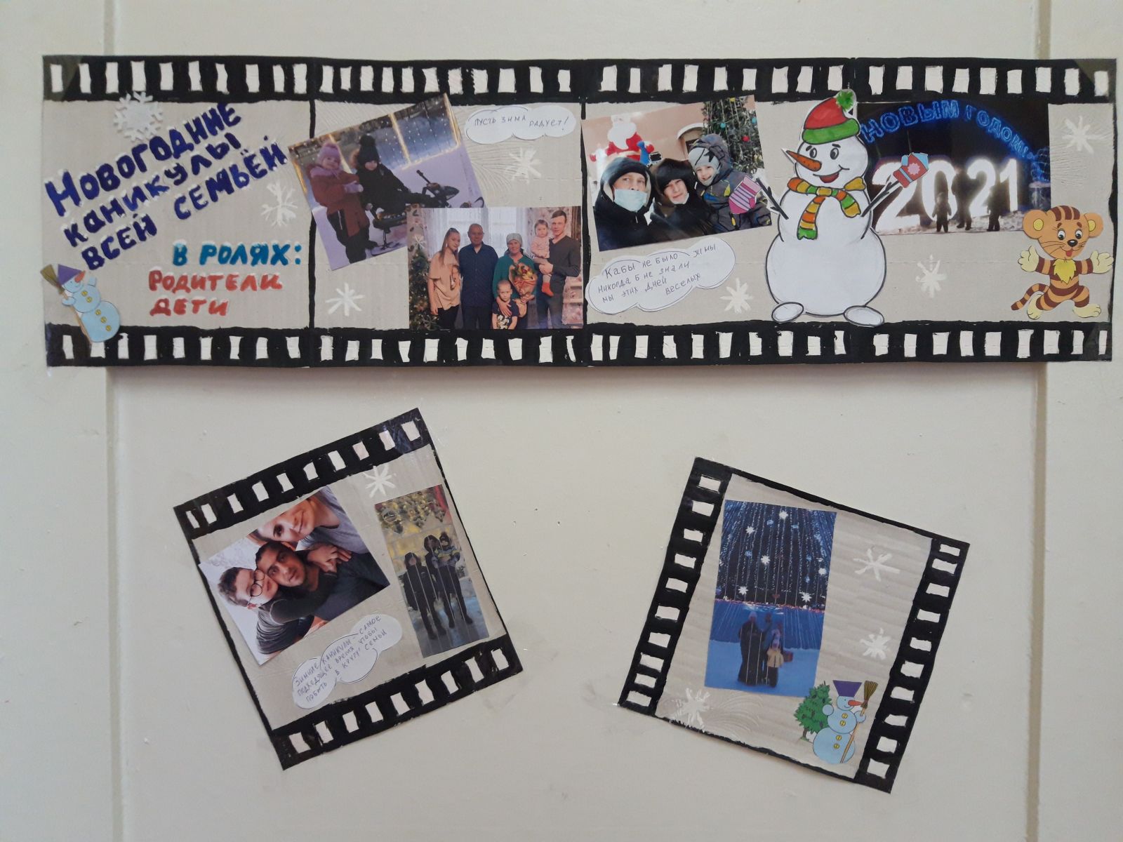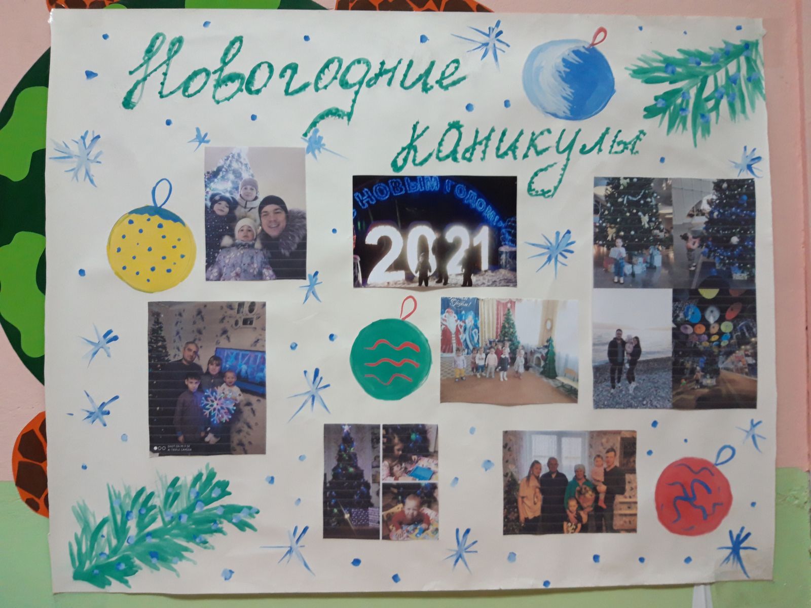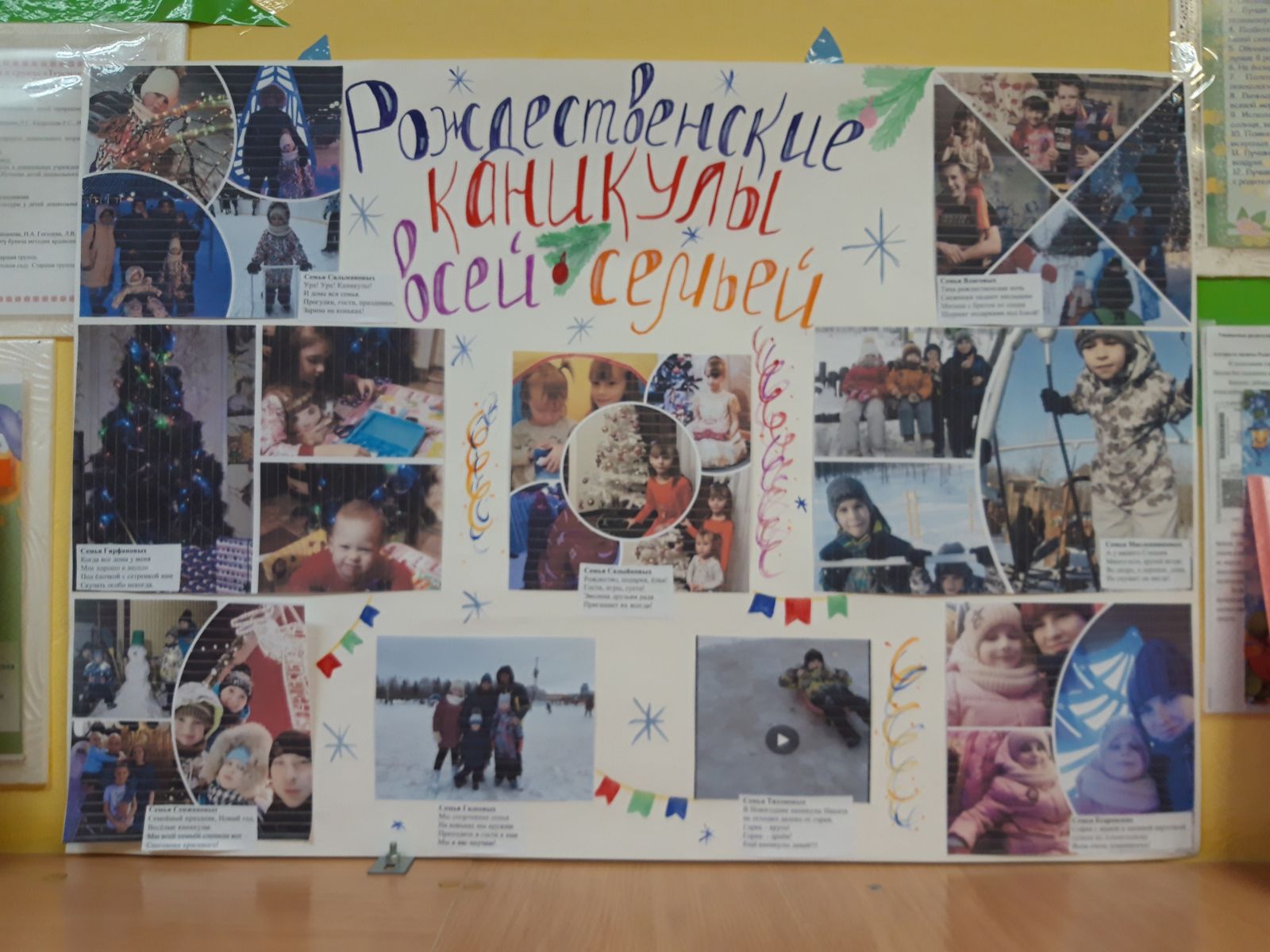 Безнең балалар бакчасында «Яңа ел каникуллары бөтен гаилә белән " дип исемләнгән стенгазета күргәзмәсе оештырылды. Күргәзмәдә гаилә белән кышкы ялның онытылмас мизгелләре турында фотографияләр, фотоколлажлар тәкъдим ителде. Кызык, матур килеп чыкты, һәркем фотосүрәтләрне рәсмиләштерүгә үз җанын кертте. Безнең балалар бакчасында тәрбияләнүчеләр үзләренең кышкы хис-тойгылары турында бик теләп сөйләделәр, ә фотографияләр аларның хикәяләрен тыңлаучылар өчен тагын да кызыклы һәм якты итеп ясадылар.