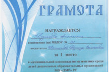 Сегодня, на базе МБДОУ №15 прошла муниципальная олимпиада по математике среди воспитанников дошкольных образовательных организаций. Наш детский сад на олимпиаде представила воспитанница подготовительной к школе группы Кузнецова Анастасия, где заняла I место. Поздравляем Настю с победой и желаем ей дальнейших успехов!!!