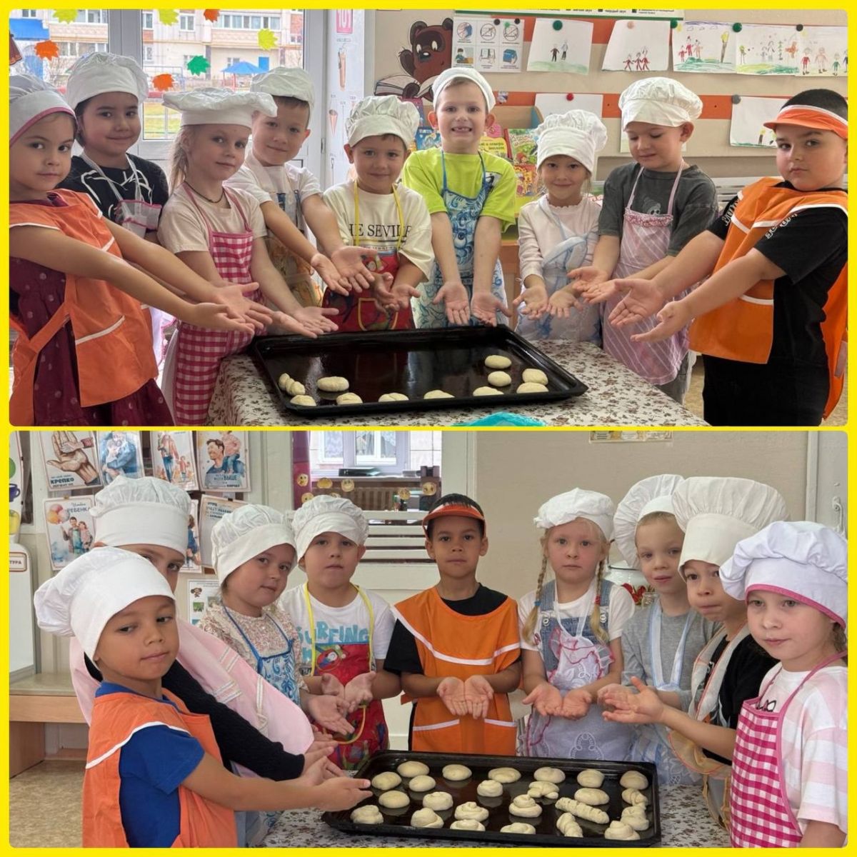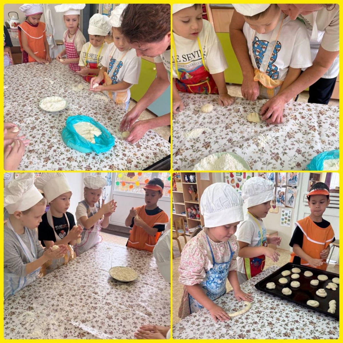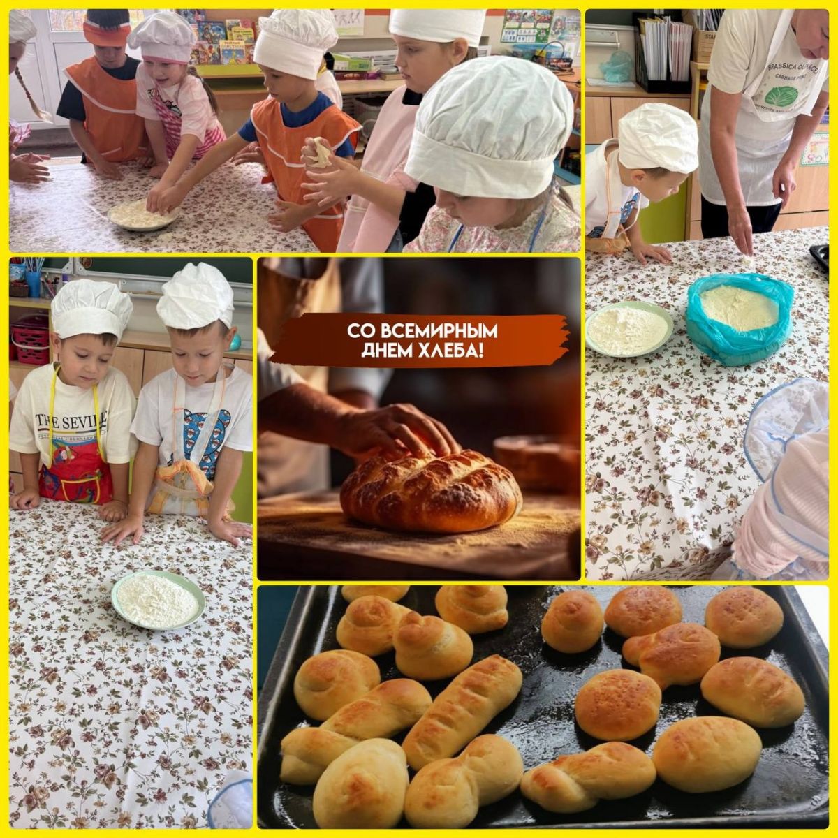 16 октября - Всемирный день хлеба. Наши подготовишки, наши Умчата вместе со своим воспитателем, младшим воспитателем и поваром испекли прекрасные батончики и булочки