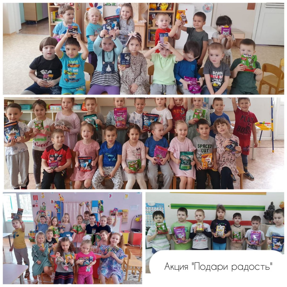 В современном мире очень много бездомных домашних животных. А ведь они тоже нуждаются в постоянной заботе человека. И без нее им просто не обойтись. Можно много говорить и рассуждать о необходимости помогать бездомным животным, а можно делать реальные добрые дела. Мы в нашем саду провели акцию "Подари радость", в честь дня кошек,который в России отмечается 1 марта.Каждый воспитанник нашего детского сада принял активное участие в нашей акции.Огромное спасибо каждому, за ваше неравнодушие, за добрые сердца и отзывчивость!