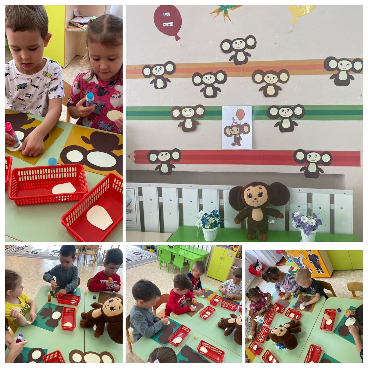 Барлык туган көн бәйрәменә бүләкләр бирү гадәте бар. Нәниләр аппликация ярдәмендә Чебурашка өчен аның сурәте төшерелгән портретлар ясаганнар.