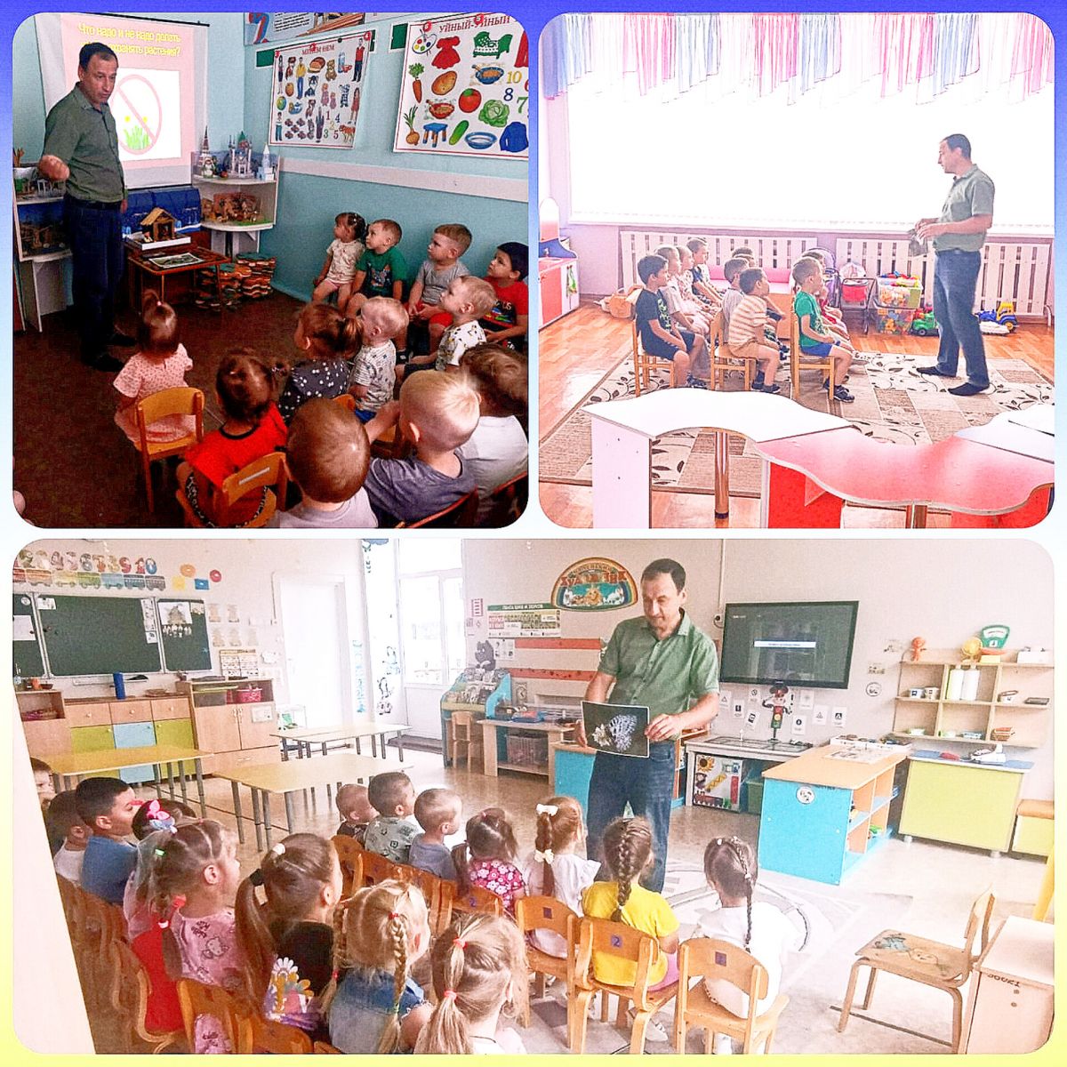 Сегодня наш детский сад посетил Галямутдинов Халил Хамитович, государственный инспектор по охране природы Государственного природного заказника «Степной» им. А.И.Щеповских. Халил Хамитович познакомил дошкольников с флорой и фауной заказника «Степной», рассказал про правила поведения на природе.