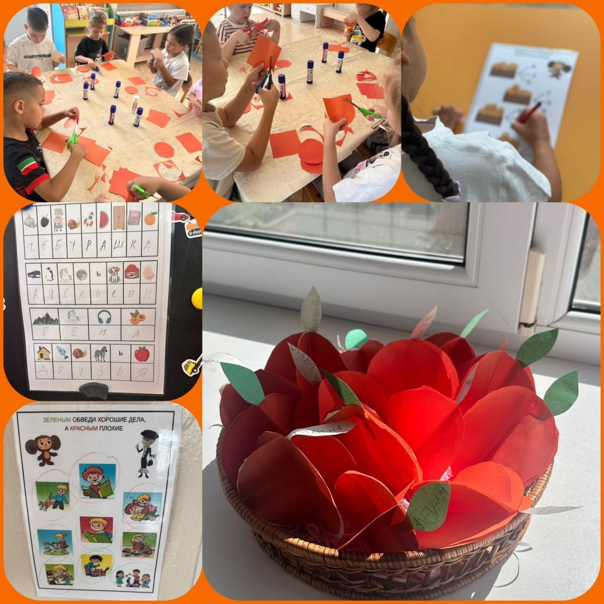 А старшая группа подготовила для Чебурашки корзину с апельсинами, а также выполняли интересные задания и с помощью Чебурашки закрепили счет, знания цифр, вспомнили хорошие и плохие поступки и расшифровали слова.