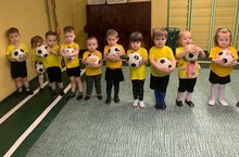 С раннего детства, любимой и одной из первых игрушек у ребенка был и остается мяч. Футбол - спортивная игра. Именно футбол, как командная спортивная игра, помогает малышу обрести себя в социуме. Постоянное общение с коллегами по игре, совместное познание азов футбола раскрывает личностные качества дошкольника. Занятия футболом способствуют развитию ловкости и координации,двигательной реакции, ориентации в пространстве.Именно поэтому на физкультурных занятиях уже с первой младшей группы начинаются вводиться элементы игры в футбол. Первые шаги делают наши малыши из группы "Любознайки" - знакомятся с футбольным мячом. -