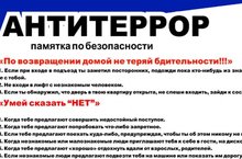 Необходимо контролировать постоянно ситуацию вокруг себя, особенно когда находитесь в транспорте, культурно-развлекательных, торговых и спортивных центрах.Не подбирайте бесхозных вещей, как бы привлекательно они не выглядели. В них могут быть скрыты взрывные устройства (в бутылках из под сока, сотовых телефонах, зажигалках и т.п.). Не пинайте на улице предметы, лежащие на земле.При обнаружении бесхозных вещей, не трогайте их! Сообщите об этом водителю общественного транспорта, сотрудникам объекта, службы безопасности, органов полиции. Ни в коем случае, не пытайтесь заглянуть внутрь данного пакета, коробки, или иного предмета.Родители! Объясните своим детям, что любой предмет, найденный на улице или в подъезде, может представлять огромную опасность. Даже обычный фонарик!При взрыве или начале стрельбы немедленно падайте на землю, лучше под прикрытие (бордюр, торговую палатку, машину и т.п.). Для большей безопасности накройте голову руками.Если вдруг началась активизация сил безопасности и правоохранительных органов, не проявляйте любопытства, идите в другую сторону, но не бегом, чтобы Вас не приняли за противника.Случайно узнав о готовящемся теракте, немедленно сообщите об этом в правоохранительные органы! -