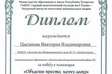 В муниципальном конкурсе для русскоязычных педагогов приняла участие от нашего детского сада Цыганова Виктория Владимировна. Молодой педагог демонстрировала приёмы работы с детьми и свои личные умения в общении на татарском языке. По итогам муниципального этапа конкурса Виктория Владимировна заняла почётное 3 место!!! А также стала одной из 16 финалисток республиканского этапа конкурса, который пройдёт 7 декабря в городе Арске. Пожелаем молодому педагогу успехов и удачи в столь сложном конкурсе!