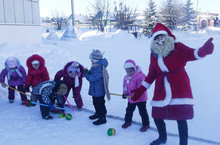 На площадку, украшенную разноцветными воздушными шарами, веселые Дедушки Морозы "Красный нос" и "Синий нос" (воспитатели Сибгатулина Г.М., Мугинова Г.М.)) пригласили ребят. Они подзадоривали ребят, веселили их, приглашали посоревноваться, предлагали детям конкурсы один другого интереснее. Особенно весёлой стала игра «Снежная фигура».