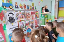 Великому русскому писателю Льву Николаевичу Толстому 195 лет. В день рождения писателя в группе " Любознайки" была организована тематическая выставка произведений для детей. Ребята вспомнили о жизни и творчестве писателя, его произведения, посмотрели анимационный фильм " Лев и собачка", который произвел на них огромное впечатление, что ребятам захотелось нарисовать героев данного рассказа. -