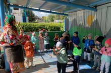 В тёплые осенние дни музыкальные развлечения и досуги в нашем детском саду проходят на воздухе, и ребятам очень нравится возможность "почуствовать" музыкальные инструменты в необычной и свободной обстановке! Кажется, что все звуки слышатся по-другому, ведь для их распространения нет препятствий в виде стен. Ребятам нравится, что на улице можно пошуметь инструментами громче обычного, эта возможность тренирует их навык слушания и простейших испольнительских приемов на музыкальных инструментах. Сегодня ребят средней группы "Фантазёры" музыкальный руководитель Галина Александровна пригласила в гости к Бабушке-Забавушке, где вместе сыграли русскую народную плясовую на детских музыкальных инструментах. Развлечение прошло шумно, весело и продуктивно! -