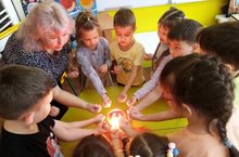 Дети подготовительной к школе группы "Сказка" сегодня с помощью машины времени переместились в будущее и оказались учениками в школе. Ребята познакомились с некоторыми школьными предметами. На уроке анатомии дети узнали, что два глаза лучше чем один, проверили это на опыте. На уроке биологии ребята проводили эксперимент с перьями и узнали, почему у водоплавающих птиц они не мокнут. На уроке химии смешивали разные вещества, узнали что такое молекулы. А ещё провели эксперимент с лампой накаливания и узнали, что чем ближе планета к Солнцу, тем на ней жарче. Данное занятие с элементами экспериментальной деятельности проводилось с детьми подготовительной группы с целью повышения их интереса к школьному обучению. -
