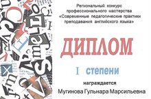 Наш педагог, Мугинова Гульнара Марсильевна, руководитель кружка "Забавный английский" стала победителем в региональном конкурсе профессионального мастерства "Современные педагогические практики преподавания английского языка", который организовал Альметьевский филиал УВО "Университет образования "ТИСБИ" и Центр детского юношеского творчества г. Альметьевска. Поздравляем Гульнару Марсильевну с успехом в профессиональном конкурсе! -
