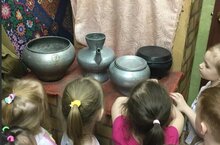 В рамках тематической недели "Путешествие в прошлое" дети 2 младшей группы "Радуга" посетили мини-музей "Деревенская изба". Здесь ребята увидели предметы старины, которыми пользовались люди прошлого. В нашем музее особые правила: у нас экспонаты можно трогать руками, чтобы почувствовать материалы, вес, размер. Так, например, старинный чугунный утюг. Ребята не ожидали, что он будет такой тяжёлый. А ухватом, оказывается, не так то просто удерживать чугунок, который нужно поставить в печь, чтобы сварить кашу."Үткәннәргә сәяхәт" тематик атнасы кысаларында "Салават күпере" 2 нче кечкенәләр төркеме балалары "авыл өе"мини-музеенда булдылар. Биредә балалар элеккеге кешеләр кулланган борынгы предметларны күрделәр. Безнең музейда аерым кагыйдәләр бар: безнең экспонатлар Материалларны, авырлыгын, күләмен тою өчен кулларыбыз белән кагарга мөмкин. Мәсәлән, борынгы чуен утюг. Балалар аның шундый авыр булыр дип көтмәгән иде. Ә ухватом, ботканы пешерү өчен мичкә куярга кирәк булган чугунны тотып тору гына түгел икән.