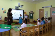 22 февраля 2019 г. воспитатель по обучению татарскому языку Шафикова Р.Д. провела открытое занятие по УМК «Говорим по-татарски» с детьми подготовительной группы «Фантазеры». Воспитанники вместе с воспитателем играли в интерактивную игру, выполняли ситуативные упражнения на татарском языке, направленные на ознакомление с новыми словами. Затем вместе со сказочными персонажами Акбаем и Мияу закрепляли эти слова с помощью пиктограмм. В ходе занятия была проведена татарская народная игра «Тюбетейка». Открытый показ завершился общим танцем под татарскую мелодию.