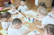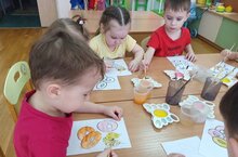 25.01.2023г, дети младшей группы "Радуга" проявили интерес к рисованию - экспериментированию "Глянь - баранки, калачи..." Учились рисовать, раскрашивать кольца (бублики, баранки и сушки), контрастные по размеру (диаметру), самостоятельно выбирать кисть: с широким ворсом - для рисования баранок, с узким ворсом - для рисования бубликов и сушек. Упражнялись в технике рисования гуашевыми красками. Развивали глазомер координацию в системе "глаз- рука" Оформили выставку рисунков, организовали сюжетно - ролевые игры в семью, угощение, праздник, ярмарку.