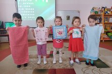 Икенче кечкенәләр төркеме балалары квадрат һәм турыпочмаклы (яулыклар һәм сөлгеләр) предметлар ясарга өйрәнделәр. "Яулыкларны һәм сөлгеләрне юабыз" буялган әйберләрне бизәү һәм сызыклы рәсем нигезендә композиция булдыру белән кызыксындылар. Гуаш буяу (кызыл, сары, зәңгәр һәм яшел) төс схемасы ярдәмендә визуаль - образлы фикерләү, эстетик-сәнгать үсешен үстерделәр.