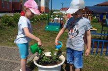 Мы,воспитатели, продолжаем работу по экологическому воспитанию детей. Беседуем с детьми о том, как можно укреплять здоровье летом, знакомим с народными приметами, наблюдаем за неживой и живой природой. Но,кроме этого, дети,при посещении теплицы учатся замечать как благоприятные условия влияют на изменения в развитии растений. Дети группы "Солнышко" во время ежедневных прогулок, совмещают наблюдение с практической деятельностью, учатся самостоятельно сажать комнатные растения,закрепляя при этом, какие условия необходимы для роста растений.