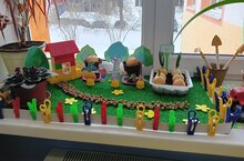 Выращивание растений на окне имеет большое значение в познавательном развитии детей, воспитании экологической культуры, правильного поведения в природе. Воспитателями была проведена планомерная работа по созданию условий для совместной деятельности педагогов и детей в процессе создания «Огорода на окне». Во всех «огородах» представлены разнообразные овощные культуры (картофель, лук, петрушка, огурцы, фасоль, горох и т.д.) и цветочные растения (астра, бархатцы, петунья и т.д.). Все воспитатели и дети оформили их как сюжетную композицию. Сколько воображения, фантазии и творчества вложено в эту работу!