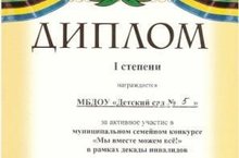 6 декабря на базе МБДОУ №6 в рамках декады инвалидов прошёл муниципальный семейный конкурс "Мы мвесте можем всё". Команда МБДОУ №5 заняла 1 место. Поздравляем и выражаем благодарность: