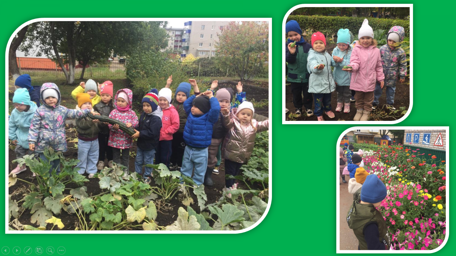 Тёплое лето уходит, но ему на смену приходит золотая осень со всей своей разнообразной палитрой самых ярких красок. На клумбе благоухают и цветут великолепные цветы, которые всех радуют и поднимают настроение. А в огороде начинается последний сбор урожая. Ребята из средней группы вместе с воспитателем Герасимовой Натальей Валерьевной. Всё лето в огороде выращивали кабачки и огурчики и у них вырос вот такой урожай!