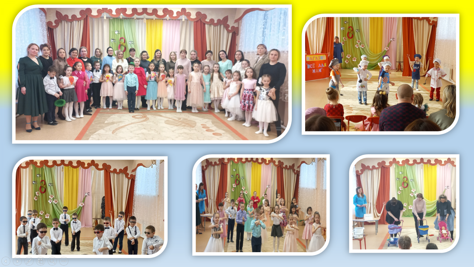 Международный женский день - это как раз тот самый праздник, когда мы можем поблагодарить своих мам и бабушек за все хорошее, что они сделали для нас, выразив свою любовь и заботу. Этот день согрет лучами солнца, женскими улыбками и украшен россыпью цветов. В преддверии праздника в нашем детском саду прошли мероприятия, посвященные женскому Дню 8 марта. Поздравления, песни, танцы и стихи звучали для Вас, наши дорогие женщины!