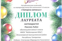 “Эрудит” татар теленнән республика олимпиадасы нәтиҗәләре билгеле булды. Менә алар: 5 нче сыйныф укучысы Павлова Лидия – 1 нче урын, 4 нче сыйныф укучылары Степанова Эвелина һәм Григорьева Дарья – 2 нче урын! Котлыйбыз! Молодцы!