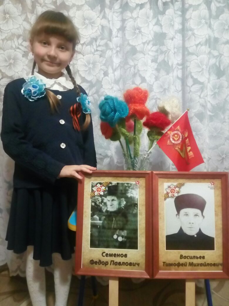 Мой прадедушка Васильев Тимофей Михайлович и прапрадедушка Семёнов Фёдор Павлович тоже были на войне и защищали нашу Родину. Они - моя гордость и отвага. Спасибо им за моё счастливое детство и за мирное небо над головой. Я кланяюсь им и буду всегда помнить об их героизме.