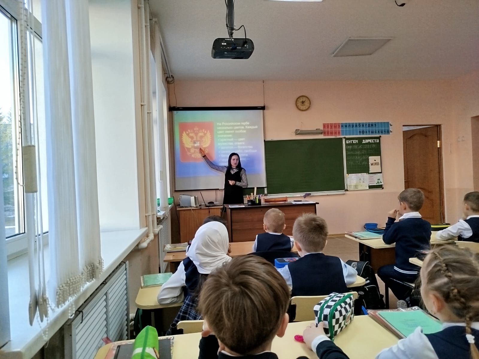 В 2а классе советник директора провела тематическое занятие, посвящённое Дню Российского герба, с целью воспитания у детей чувства любви и гордости за свою страну. Учащиеся вспомнили символы России — флаг, гимн и герб.