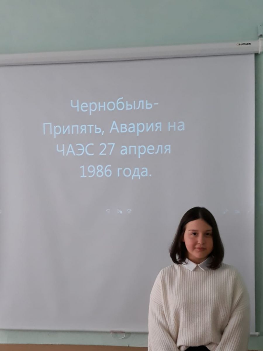 28 апреля в 8 Б классе прошёл классный час посвящённый 35-ой годовщине одной из страшнейших трагедий XX века - аварии на Чернобыльской АЭС. Ребята познакомились с хроникой тех ужасных событий, с подвигом людей, проявивших смелость и отвагу при ликвидации последствий аварии, а также рассказали о том, что они сами знали о ней ранее. Целью проведения классного часа было рассказать учащимся о чернобыльской трагедии, способствовать формированию экологических знаний и использованию их в учебной и практической деятельности. Развивать позитивную активную жизненную позицию. Воспитывать чувство сострадания.