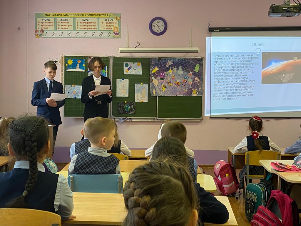 В рамках проведения мероприятий, приуроченных к 60-летию полета Ю.А.Гагарина в космос, 7 апреля учащиеся 10 класса под руководством Галиуллиной Ф.Х., учителя физики, провели акцию - флешмоб «Наука – это космос» для 1-8 классов.