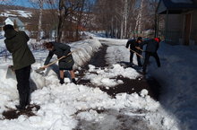 В рамках экологического двухмесячника учащиеся 8 класса раскидывали снег на территории школы.
