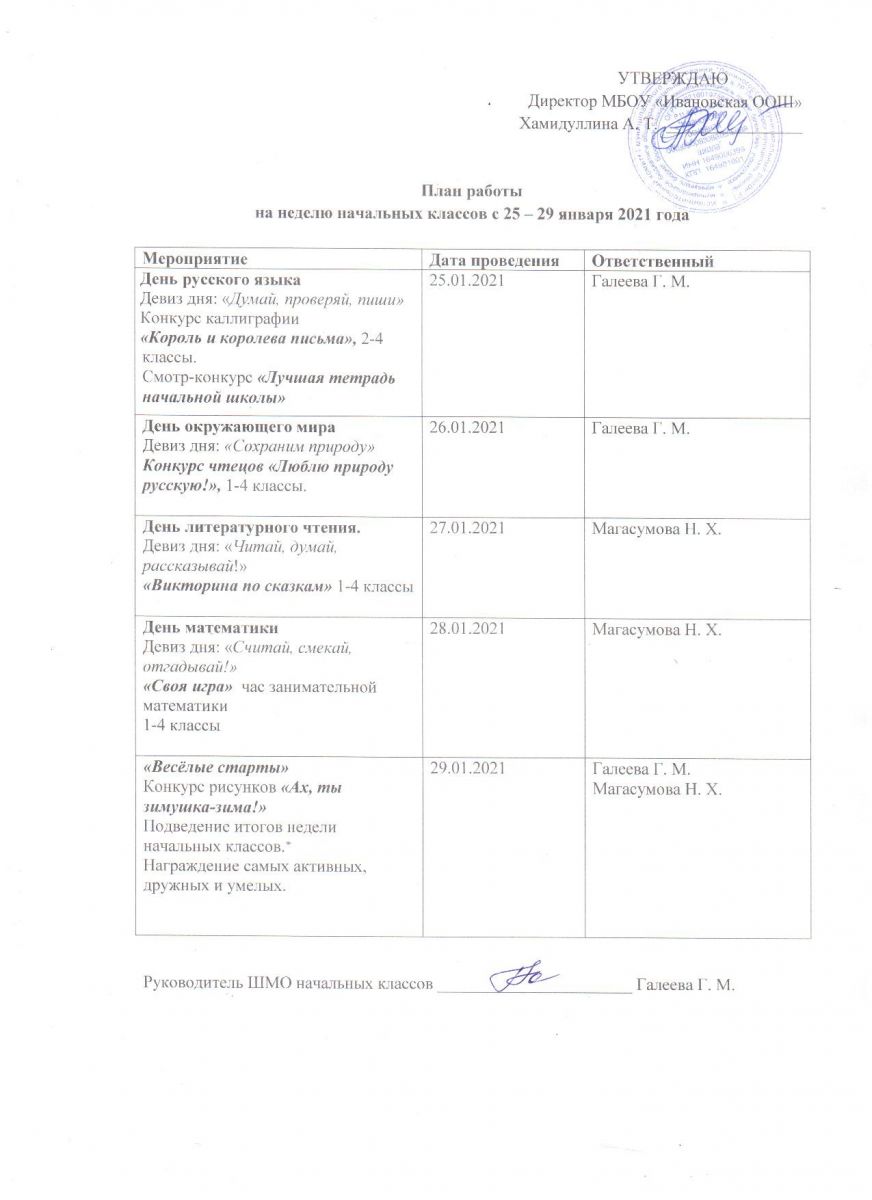 План проведения недели начальных классов 25.01.2021