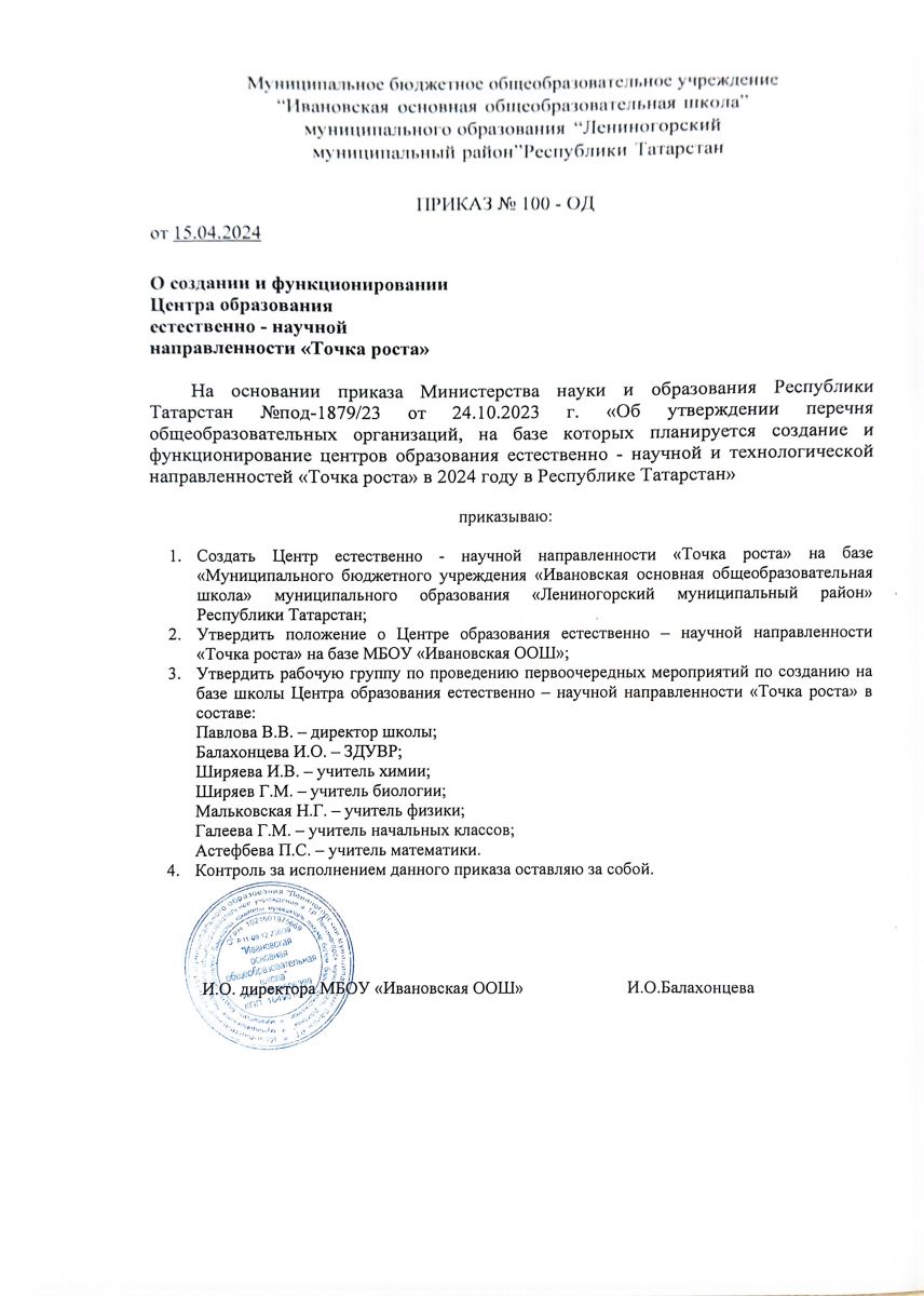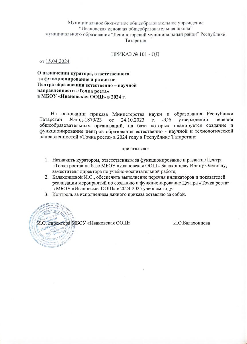 Приказ Министерства образования и науки Республики Татарстан "Об утверждении перечня общеобразовательных организаций, на базе которых планируется создание и функционирование центров образования естественно-научной и технологической направленности "Точка роста" в 2024 году в Республике Татарстан № под - 1879/23 от 24.10.2023 года