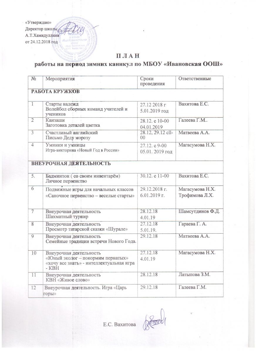 План работы на период зимних каникул 2018-2019