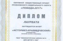 Руководитель музея Марисова М.С. с учащимися приняла участие в региональном этапе окружного общественного проекта Приволжского федерального округа «Победа – 2017» среди образовательных организаций Республики Татарстан и военно – патриотических клубов. В номинации «Лучший музей». И работа была высоко оценена, и заняли призовое место. Награждены дипломом лауреата. Поздравляем!!! Желаем творческих успехов!