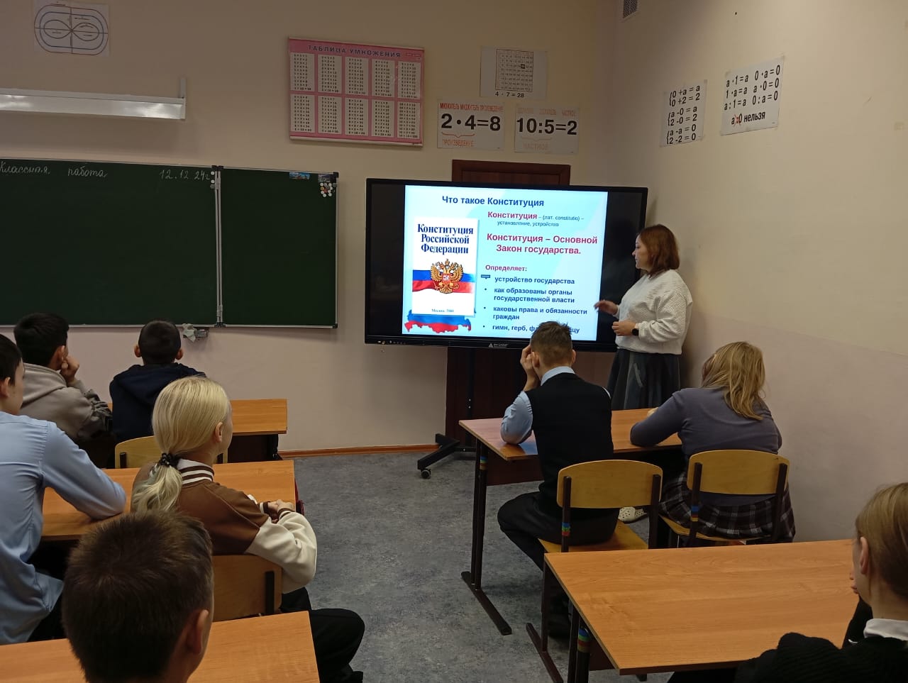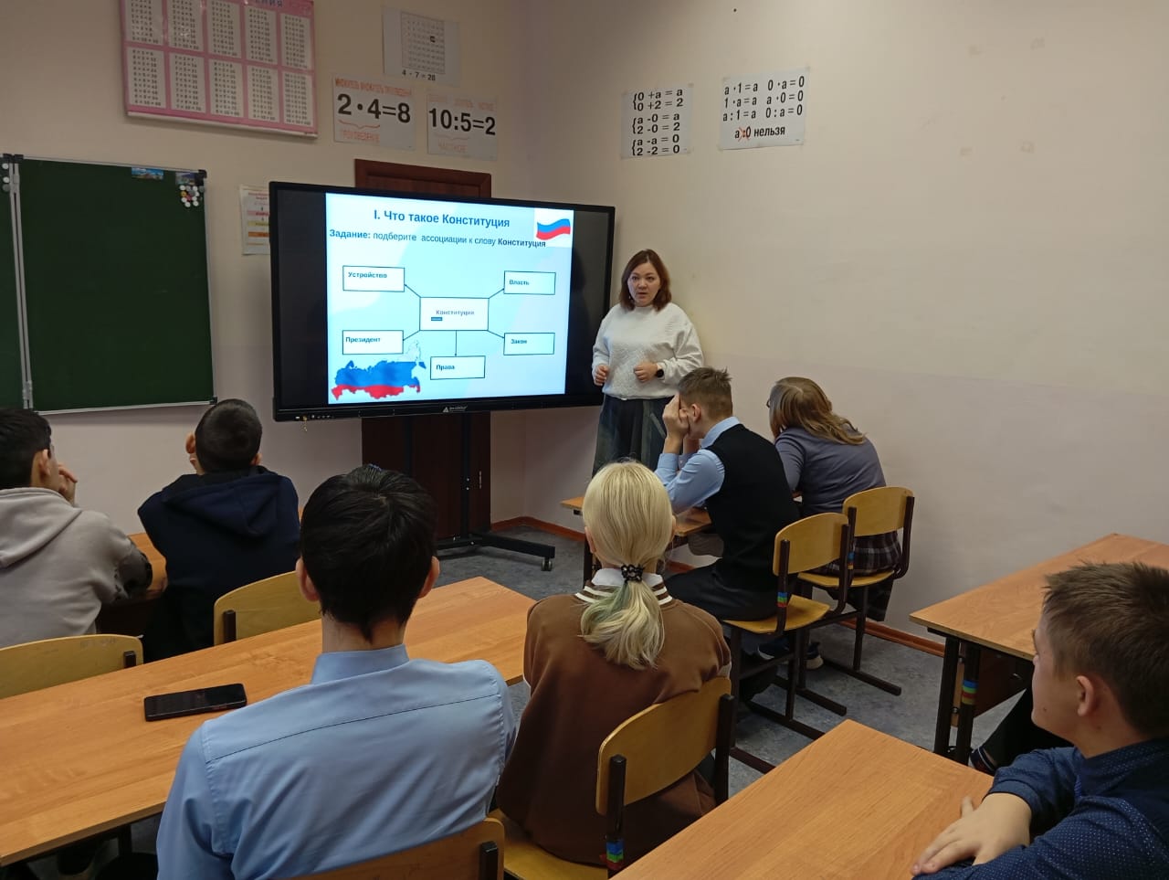 В День Конституции РФ, классный руководитель Перовская К.Р. провела внеклассное мероприятие для 6-8 классов. Ребят познакомили с историей создания Конституции, с определенными понятиями, как: «Что такое Конституция и что определяет Конституция?», «Что такое закон?», «Что такое преамбула?», «Что такое гражданство?». Так же вспомнили, что у гражданина РФ есть как права, так и обязанности. Обсудили: какие права и обязанности есть у гражданин России.