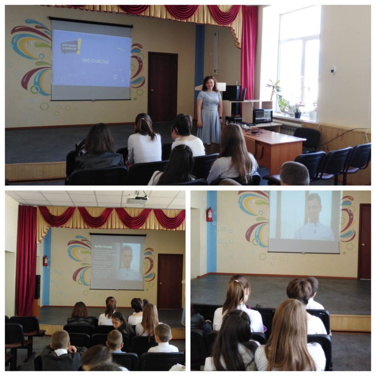 В конце занятия ученики послушали песню про счастье, посмотрели рисунки учащихся других школ России на тему, как у них ассоциируется счастье.