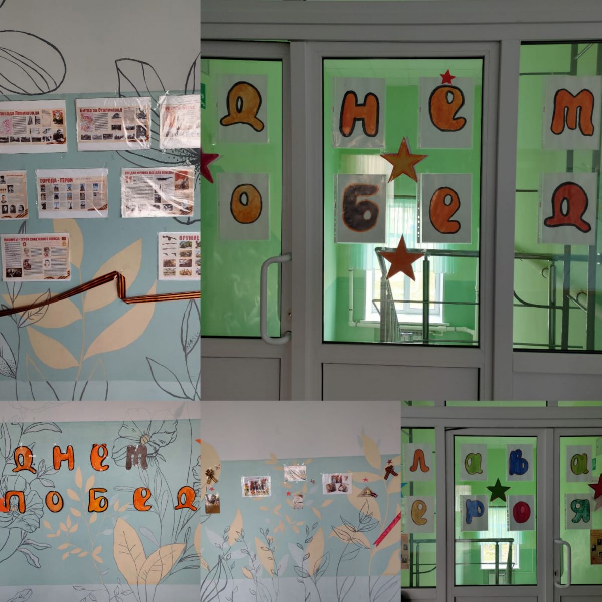 Учащиеся 5, 6 ,7а и 7 б классов под руководством Марисовой М.С. украсили школьный этаж ко Дню Победы- 9 Мая.