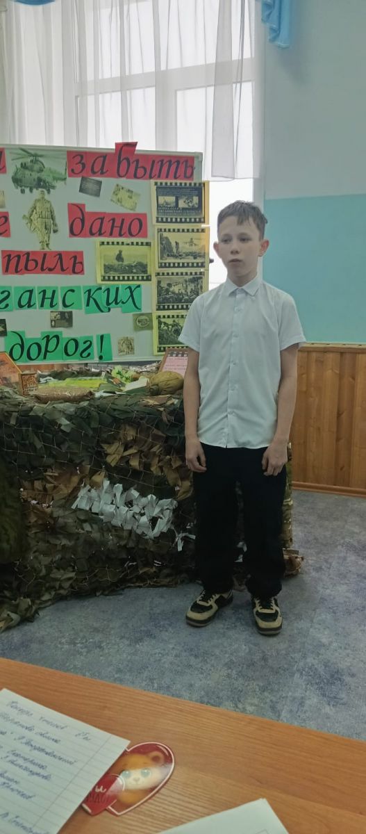 15 февраля 2026 года отмечается 37-я годовщина со дня вывода советских войск из Афганистана. Эта дата считается официальным днём завершения Афганской войны, которая продлилась почти десять лет и унесла жизни более 15 тысяч советских граждан. 12 февраля, в канун этой даты, состоялась памятная встреча учащихся 5-9х классов с ветераном афганской войны Хакимовым Ильдаром Яфасовичем и Анатолием Николаевичем Бариновым участником местного Лениногорского отделения ТРО ВООВ и «Боевые братство». Учителями Гайнановой А.Л., Марисовой М.С. и Королёвой О.В. для учеников школы была организована тематическая выставка "Нам забыть не дано пыль афганских дорог". Экспозиция включала в себя предметы, которые дают представление о быте и вооружении солдат: сухпаек, головные уборы –панаму, автомат Калашникова. Также были представлены фотографии и дембельский блокнот "Солдаты необъявленной войны", позволяющие глубже понять реалии того времени. В начале мероприятия учитель истории и географии Марисова Марина Степановна напомнила ученикам о хронологии тех событий, героизме солдат и офицеров, которые в сложнейших условиях высоко несли звание защитника Отечества, сохраняя верность военной присяге и долгу. Из Лениногорского района в Афганской войне участвовало более 100 человек. Среди погибших – наши воины-земляки, которые прошли огненными дорогами Афганистана. Мы вспомнили их поимённо: Гараев Рафик Мансурович 1964 – 1982 Гарифуллин Минислам Миниханович 1960 - 1980 Ершов Сергей Михайлович 1961 - 1980 Зарипов Анис Дависович 1965 - 1981 Игнатьев Сергей Васильевич 1965 - 1984 Плешаков Геннадий Алексеевич 1959 - 1980 Станюков Сергей Викторович 1959 - 1981 Стулов Евгений Николаевич 1959 - 1980 Фаррахов Эраст Ранасович 1966 - 1986 Шайдуллин Ильшат Сагитович 1965 - 1985 Вечная память Героям... Поделившись воспоминаниями о службе, ветеран рассказал ребятам и о своем трудовом пути. Обращаясь к старшеклассникам Ильдар Яфасович призвал их любить Родину, быть достойными гражданами и патриотами своей великой страны. В заключение присутствующие почтили память всех советских солдат, погибших в Афганистане минутой молчания.